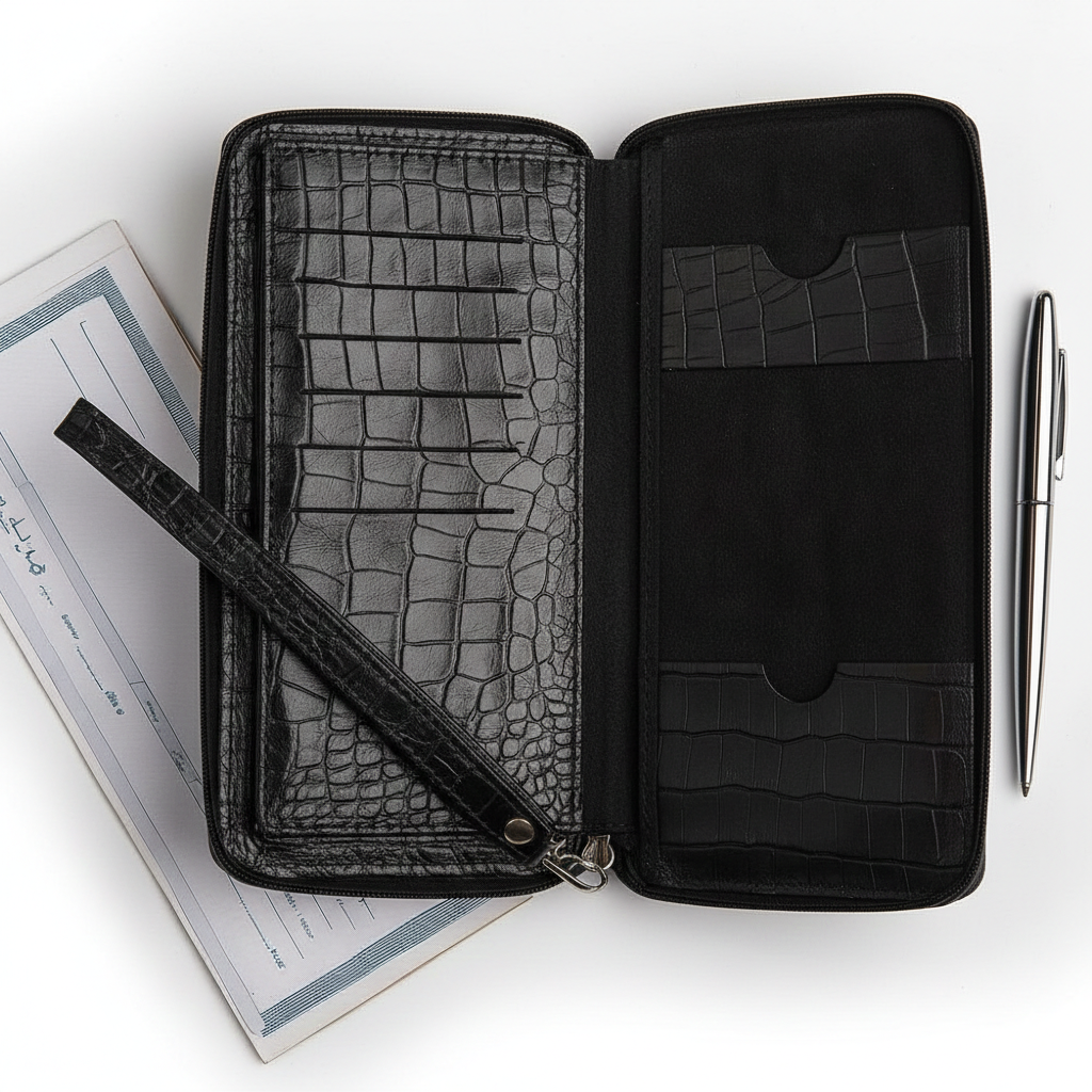 کاملاً چرم گاوی، طراحی رسمی و شیک، مناسب اسناد، کارتها و دسته چک.