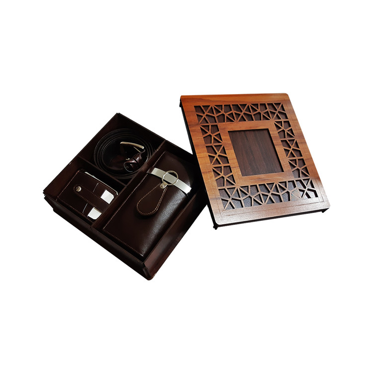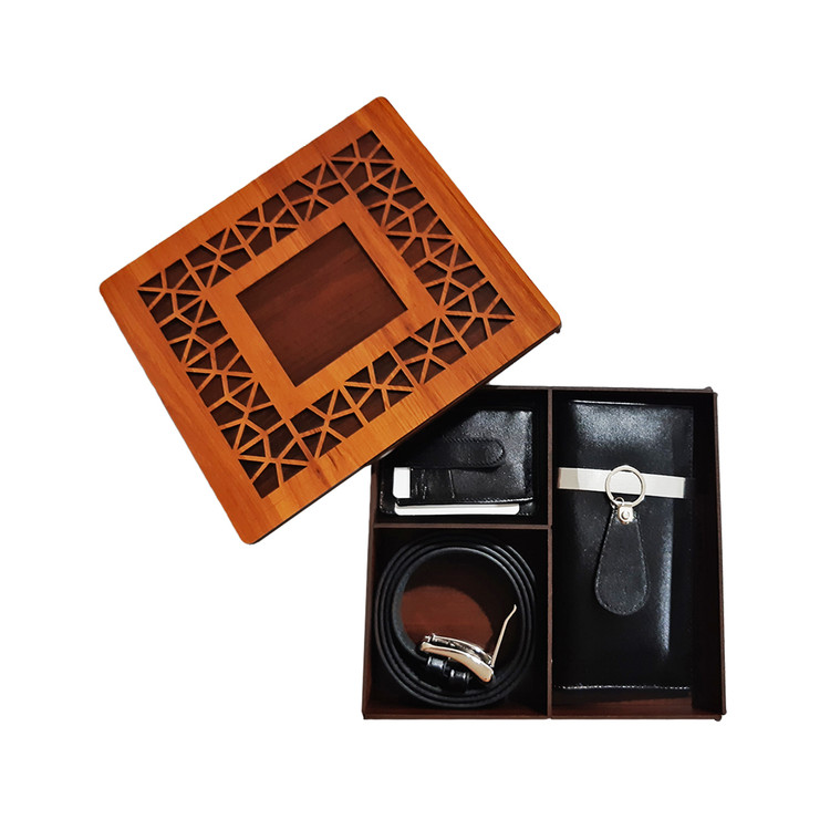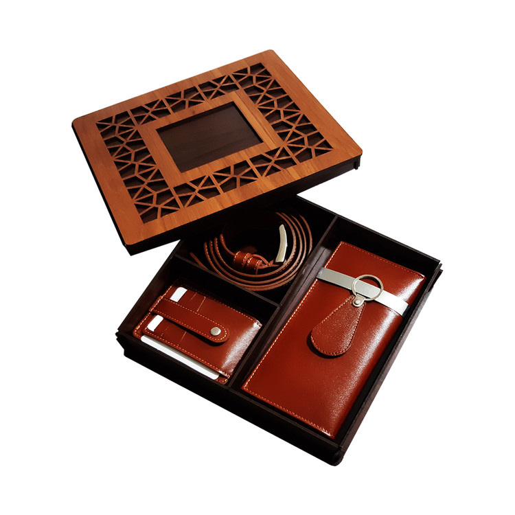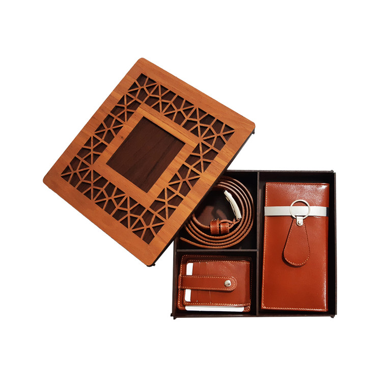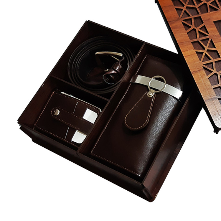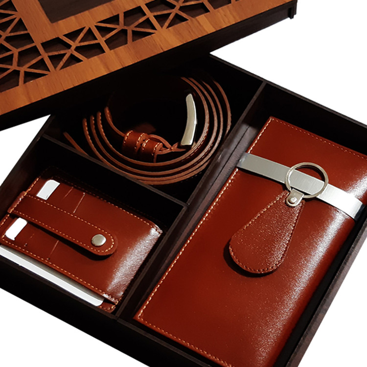 ست هدیه ۴ تکه مردانه تمام چرم طبیعی جعبه چوبی با پک هدیه کد ۷۸۳